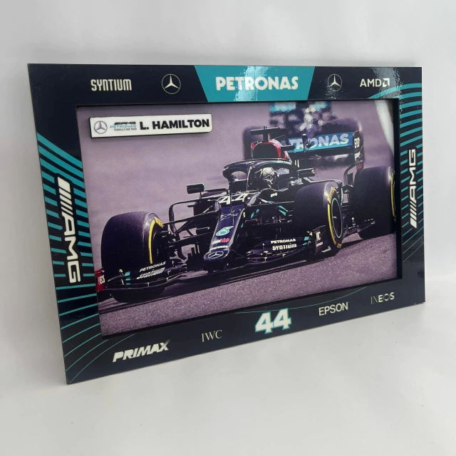 O combo inclui um quadro decorativo com o carro de Lewis Hamilton em ação e um pedestal elegante para exibição do capacete. Juntos, eles compõem uma decoração sofisticada, ideal para salas, escritórios ou espaços temáticos.